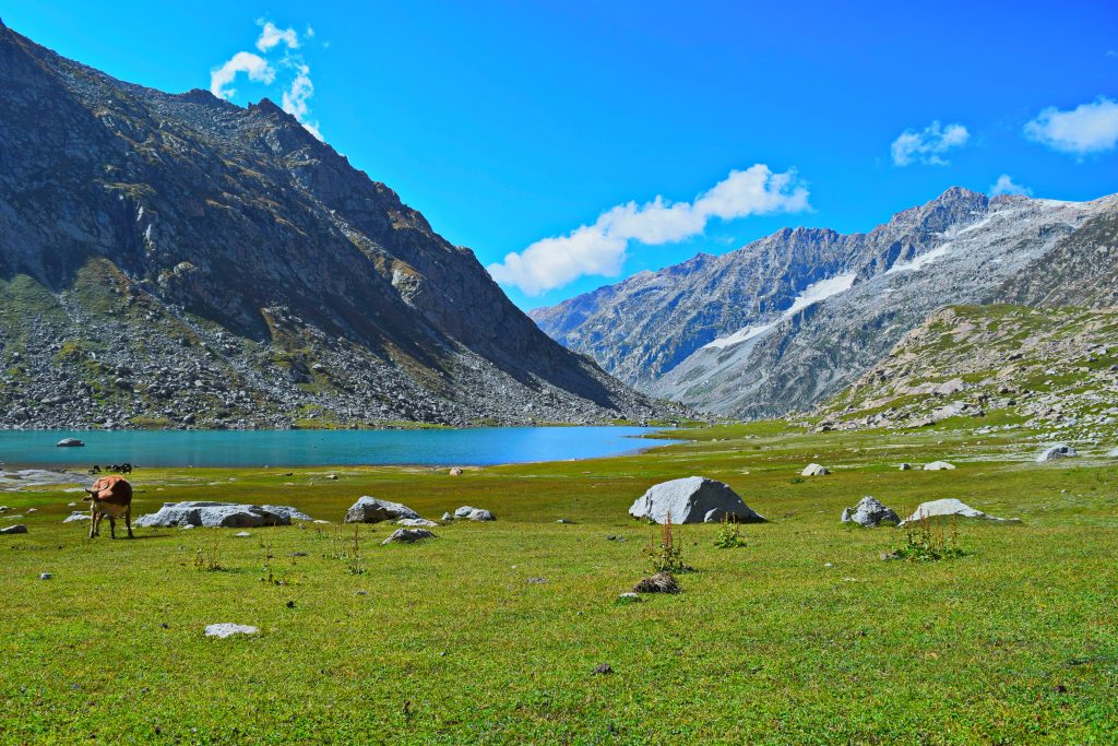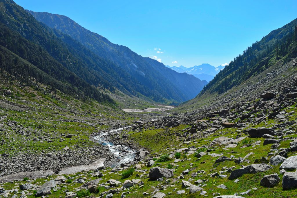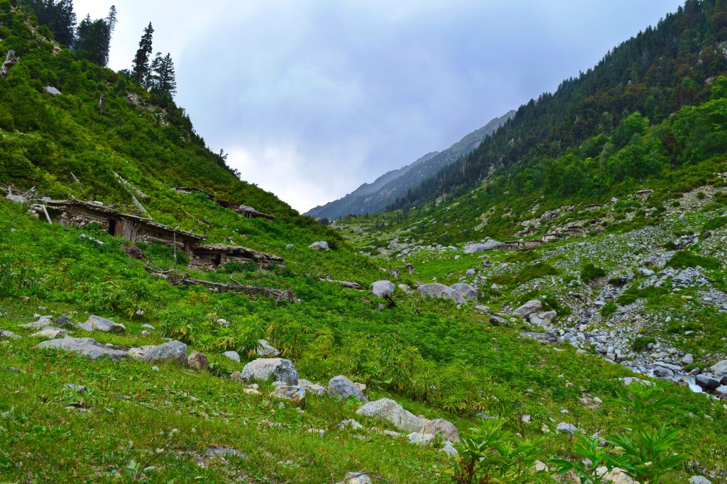 We started our trek early in the morning from Kedam in a valley marked by alpine trees, pastures and peaks. The valley is narrow at the start, and heavily forested. As the forest zone ends, the valley widens and the lower pastures come into sight.