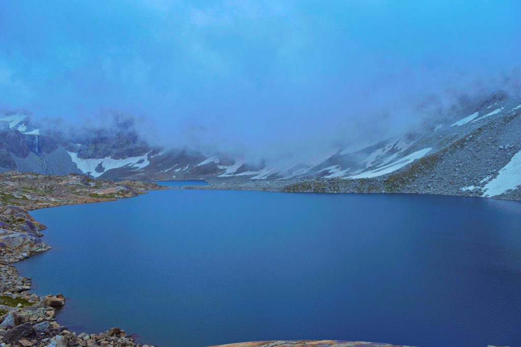 After a hectic trek of five hours we see our first glimpse of Shaitangoot. The very first look of Shaitangoot Lake takes all the fatigue and tiredness from us and refreshed us mentally and physically. Shaitangoot Lake is situated at an altitude of 13,500 feet above sea level and is probably the highest among all the so-far discovered lakes in Swat. It is also a gateway to other lakes and mountain passes. Towards its west is the famous Kundol lake, towards its north are Spin Khwar Lake and Godar Lake and towards its south is situated the unexplored lake of Kandora, which is famous for its black water. We explore every corner of this beautiful glacial lake and spend time there till evening. The scene is immensely enchanting. There is no sound except the bursting of the smaller glaciers hidden in the cold mist surrounding the peaks.